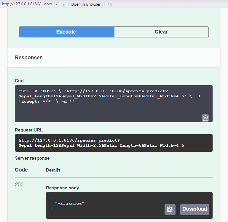 L’image ci-après donne la prédiction du modèle en fonction des valeurs introduites dans l’image précédente. On peut voir sur l’image que nous avons obtenu le code 200, qui correspond à la réussite de notre réquête et l’espèce prédite “virginica” dans “Response body”.