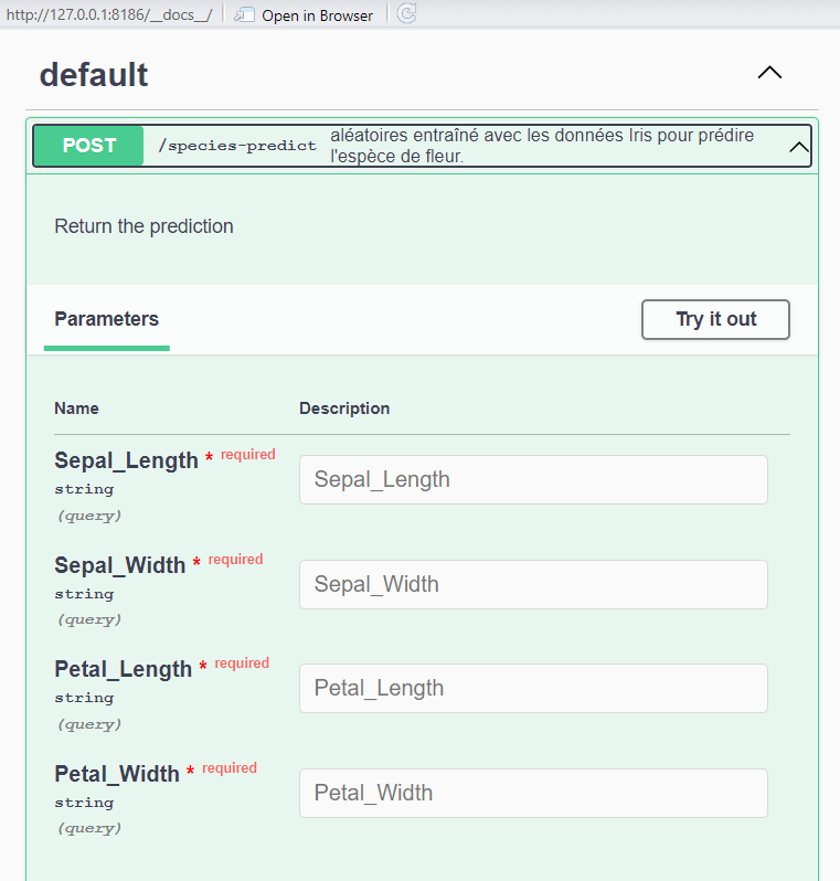 Pour accéder à la route POST où se trouve notre modèle, cliquez sur POST. Cela affiche les différents paramètres d’entré du modèle. Pour pouvoir introduire les valeurs de chaque paramètre, il suffit de cliquer sur “Try it out”.